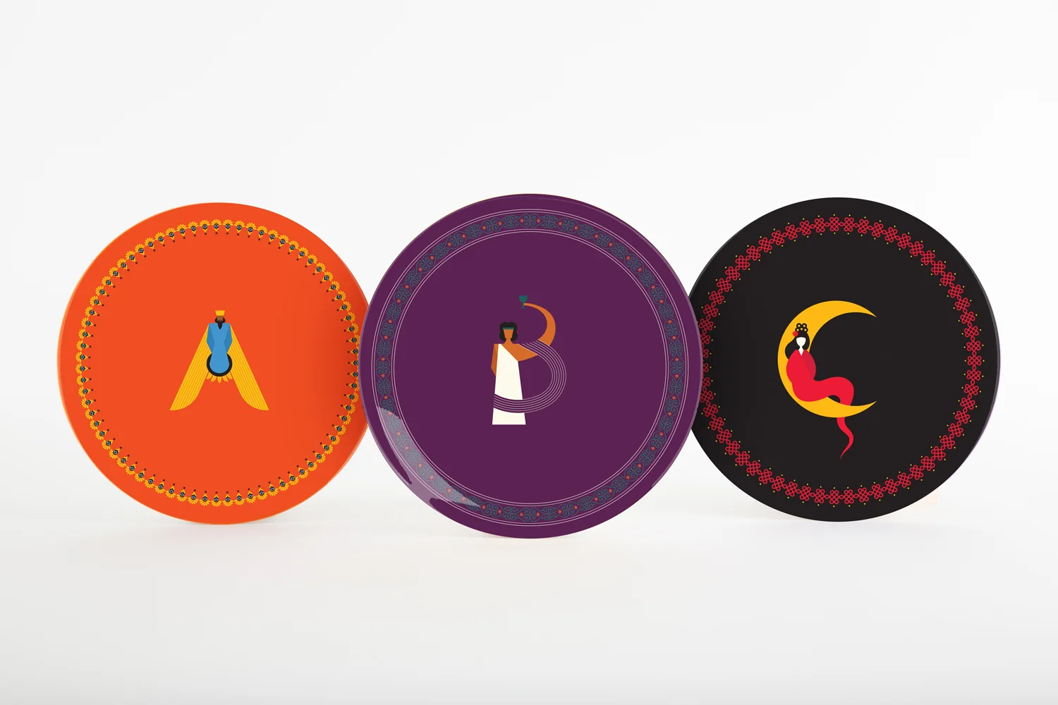Each letter takes the form of the deity, and conveys what they are the god of (for example, Kishimo Jin (K) is the Japanese goddess of children and childbirth). My goal was to execute the design of each letter as simply and as geometric as possible, so that all of the plates would hold together. I chose to show the rich heritage of each culture by creating patterns around the outside of the plate based on textiles, carvings, etc. unique to that specific part of the world.